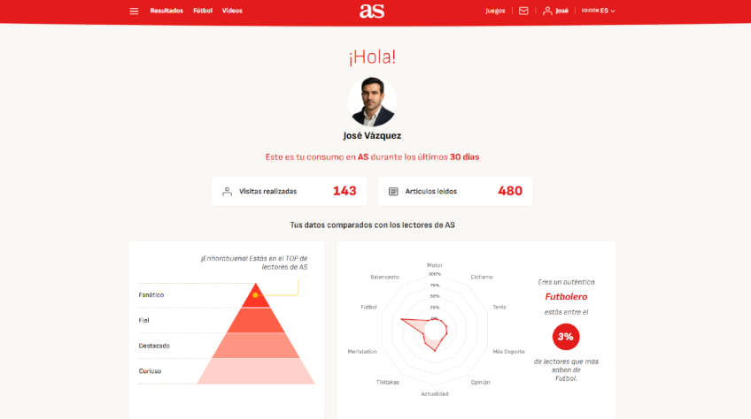 AS da un paso más para recompensar la fidelidad de sus lectores y lanza Mi Temporada, un espacio personalizado en el que los usuarios registrados van a encontrar noticias de última hora recomendadas en función de sus intereses y lecturas previas, además de filtrar los artículos sobre sus deportes favoritos. La plataforma permite a los lectores conocer datos curiosos a partir de sus métricas de consumo. Se puede acceder al espacio desde el perfil de cada usuario, en el menú superior de as.com.