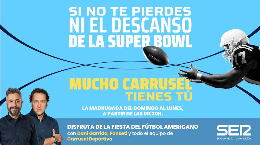 Un año más la Cadena SER retransmitirá el partido que decidirá al ganador de la Super Bowl. Dani Garrido, junto a Álvaro Benito, en un especial de 'Carrusel Deportivo', y José Antonio Ponseti, desde San Francisco, liderarán la cobertura especial del gran evento que enfrentará a los New England Patriots de Drake Maye y los Seattle Seahawks de Sam Darnold por el trofeo Vince Lombardi.